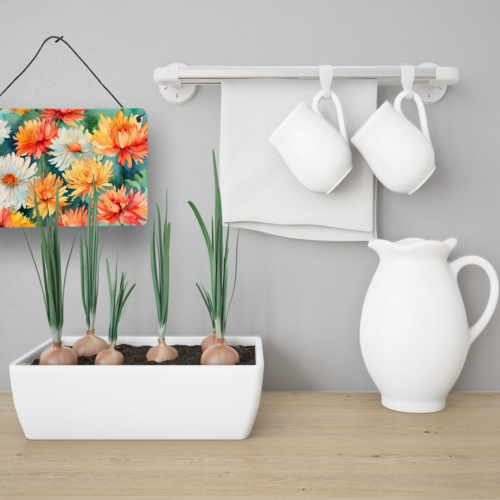 Wall or Door Hanging Prints featuring breed specific Chrysanthemums artwork. Add a splash of color and artistic flair to any indoor or outdoor space with our Aluminum Artwork Prints. These unique prints, featuring full-color, multicolor designs, provide a versatile decorative touch that can enhance a kitchen, bathroom, office, outdoor patio, or even the front door area. Each print measures 8 inches by 12 inches, making it the perfect size to catch the eye without overwhelming your space. Constructed with durability in mind, these prints can be placed outdoors and withstand direct sunlight for a significant amount of time before any fading begins. Designed for easy installation, each print features a black hanging rope and has a lightweight profile. This allows for quick hanging with just about any nail or screw. For safety and aesthetic appeal, the print’s corners are gently rounded. The back of the print showcases a brushed silver color for an added touch of elegance. Rust and fade-resistant, these Aluminum Artwork Prints are not only beautiful but are also built to last. Elevate your space with these stunning prints, crafted with care and artistic passion.
