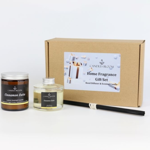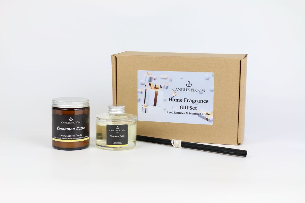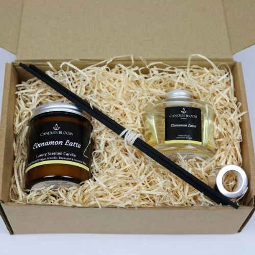 A beautifully curated gift set featuring a Cinnamon Latte scented candle and matching reed diffuser – perfect for creating a calming ambiance in any room. Cinnamon Latte fragrance has a warming top notes of fresh cream, followed by earthy middle notes of cinnamon, clove, and mixed spices, which is set on a hearty base of freshly brewed Brazilian coffee.
