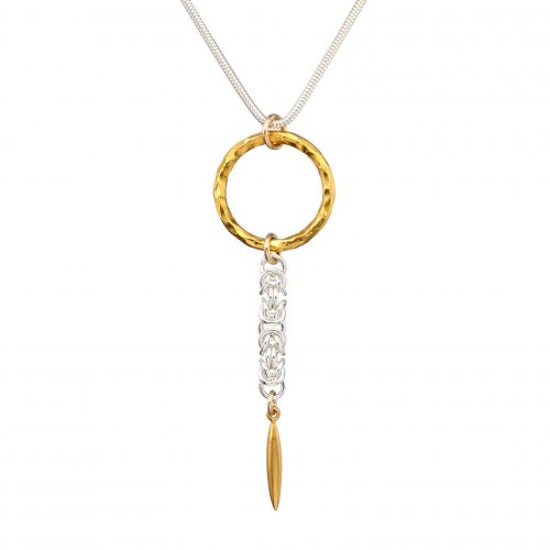 Sterling silver Byzantine chainmaille pendant with 24k yellow gold Vermeil* large hammered “Circle of Life” ring (25 mm), sterling silver snake chain – necklace 16” long