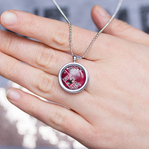 The Necklace is made with a piece of real circuit board in a metal frame. The board piece is 9/16″ (15 mm) in diameter. The necklace comes with a ball chain 26 inches long, and you may cut it to any length you want.