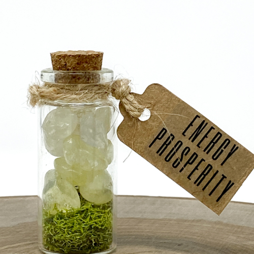 Citrine crystals rest on a bed of reindeer moss in a glass vile with a cork closure.