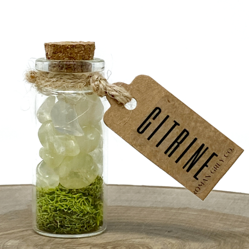 Citrine crystals rest on a bed of reindeer moss in a glass vile with a cork closure.