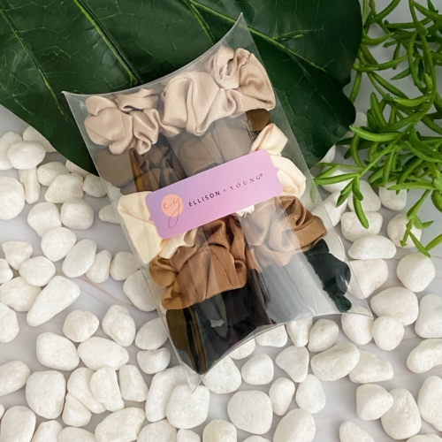 This Classic Satin Scrunch Set of 5 is the perfect everyday hair accessory. Featuring simple and understated scrunches in neutral colors, the soft satin fabric and slim body are designed for simple and yet stylish hair management. Each set presented in a clear cello cute case and branded with Ellison + Young logo sticker. Dimensions: approximately 3.5″ x 5.5″ x 1.2″ Made in China