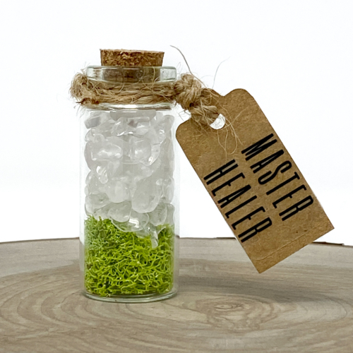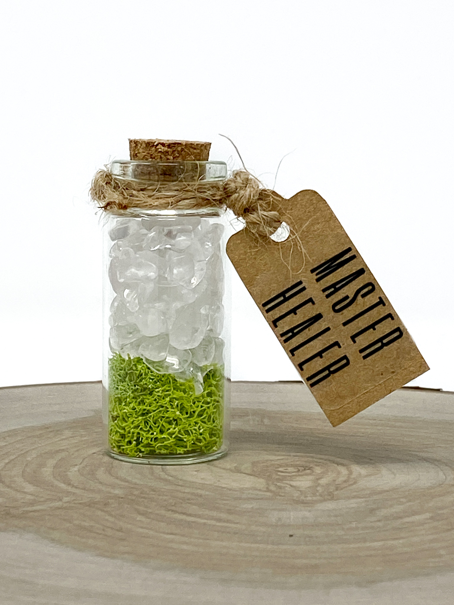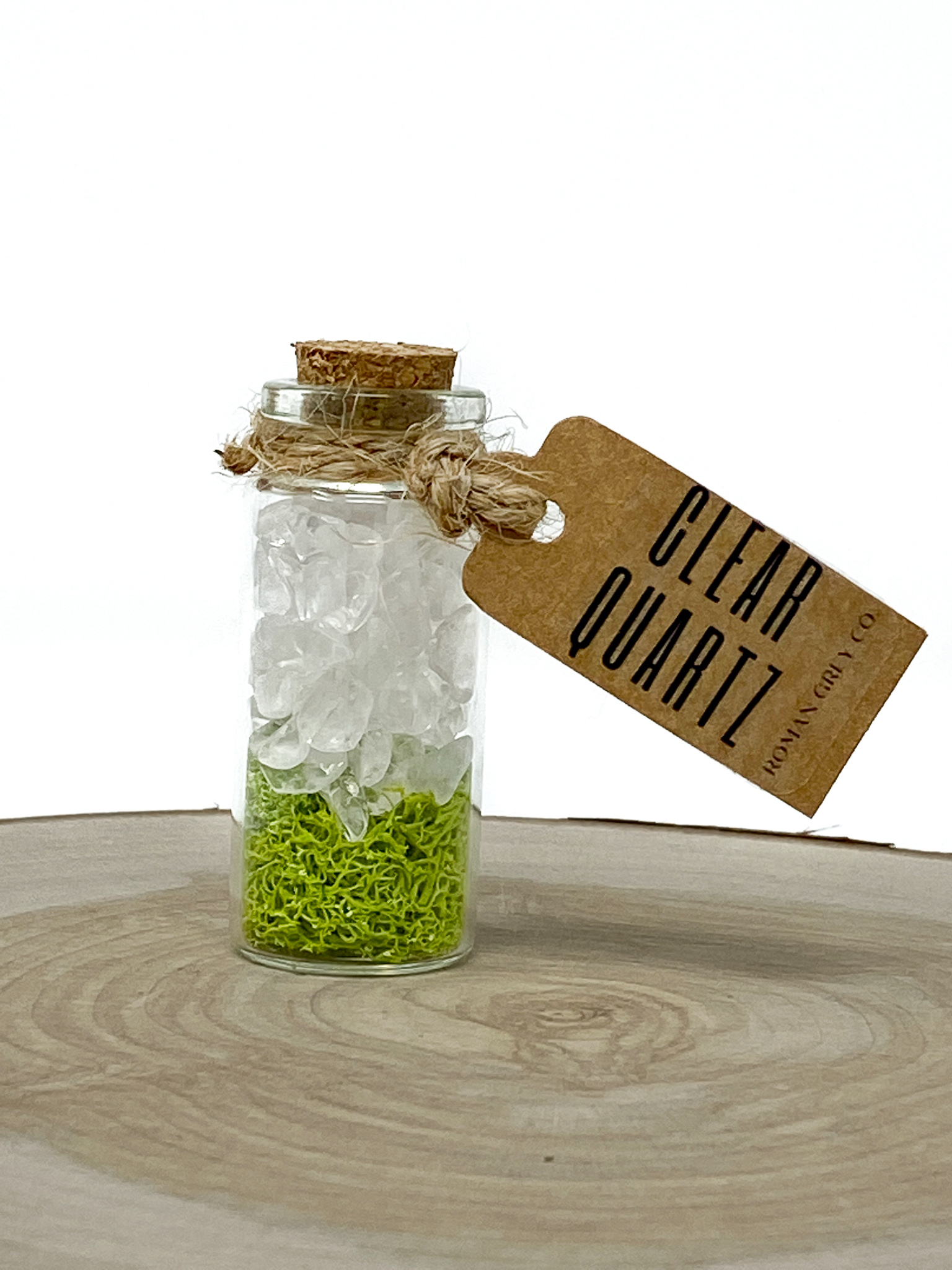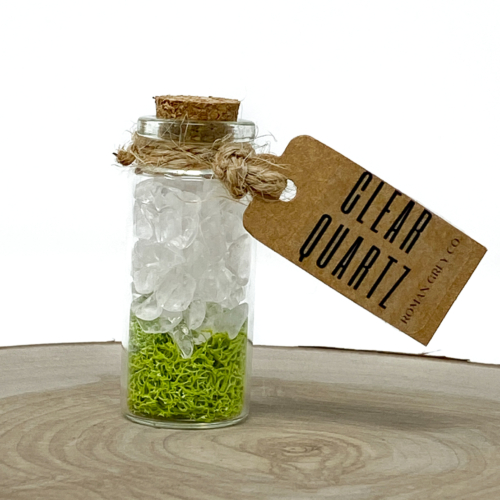 Clear Quartz crystals rest on a bed of Spanish moss in a glass vile with a cork closure.
