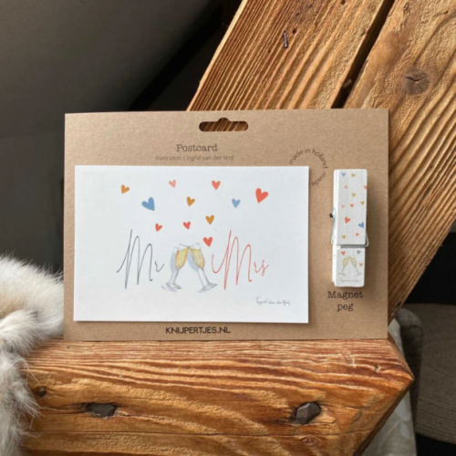 Our clothespin with magnet and postcard is exclusively from Knijpertjes and designed in collaboration with Ingrid van der Krol.