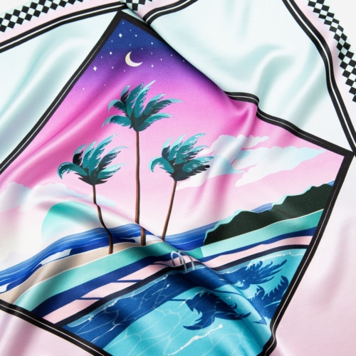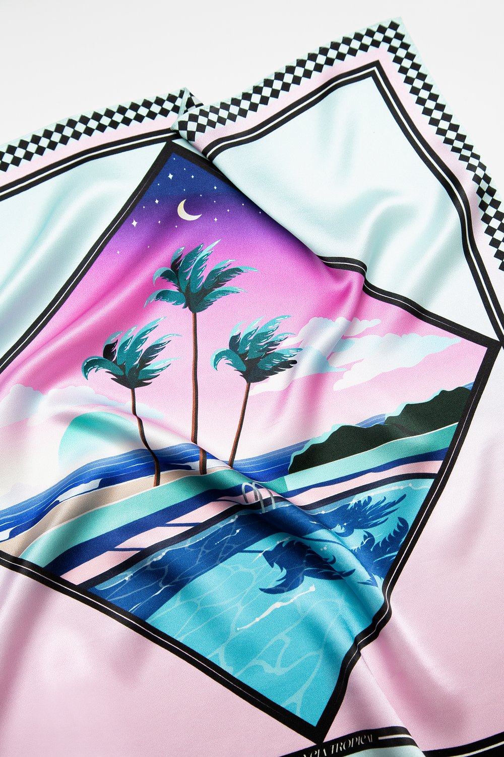 The Club Tropicana bandana is handcrafted from pure silk fabric. It features a colorful and Hawaiian-inspired, tropical print.