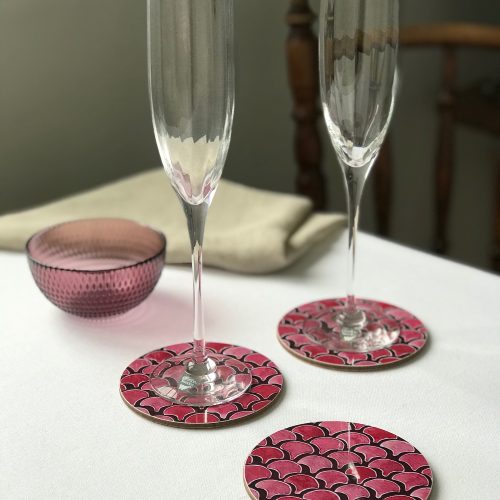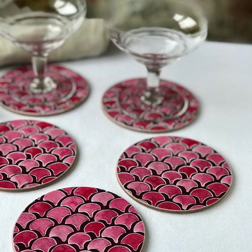 Beautiful and unique round coasters in dusky pink tones with a superior gloss finish. Meticulously hand-illustrated, my designs are inspired by my treasured Scandinavian upbringing. Each design is named after a person or a place close to my heart in Sweden.