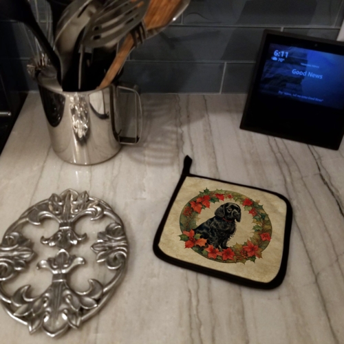 Pair of Pot Holders featuring breed specific Cocker Spaniel artwork. Celebrate Christmas with this Christmas Pair of Pot Holders. A Pair of Pot Holders to match your kitchen decor. Made in the USA these are thick and functional. Full color artwork decorates the front polyester fabric of the hot pad and accented by a black trim. Use these at as a trivet for your Thanksgiving or Christmas tablescape. Filled with insulated fabric and quilted for durability. These colorful pot holders will make a great gift for your favorite home cook or executive chef. Each pot holder measures approximately 7 1/2 inches by 7 1/2 inches. A hanging tab is included.