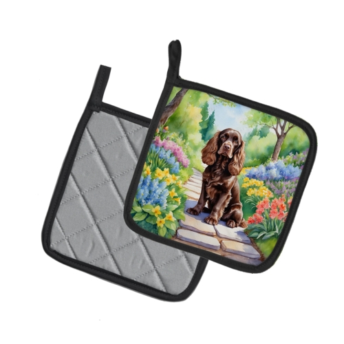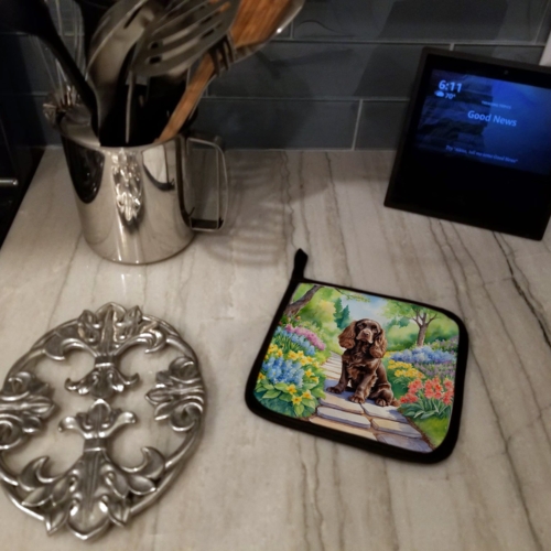 Pair of Pot Holders featuring breed specific Cocker Spaniel artwork. A Pair of Pot Holders to match your kitchen decor. Made in the USA these are thick and functional. Full color artwork decorates the front polyester fabric of the hot pad and accented by a black trim. Use these at as a trivet for your Thanksgiving or Christmas tablescape. Filled with insulated fabric and quilted for durability. These colorful pot holders will make a great gift for your favorite home cook or executive chef. Each pot holder measures approximately 7 1/2 inches by 7 1/2 inches. A hanging tab is included.