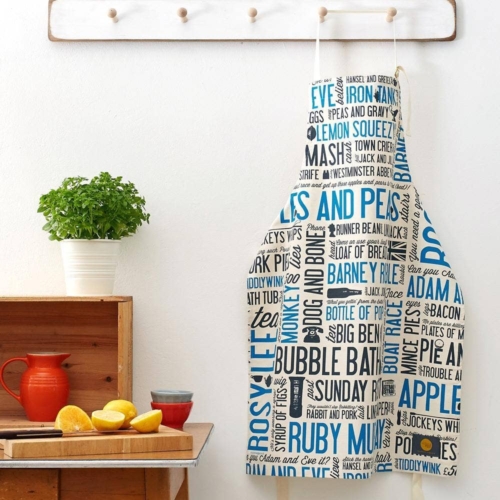 The bold typographic Cockney Rhyming Slang apron features well loved and known cockney phrases, including Apples & Pears (stairs), Bubble Bath (laugh), Rosy Lee (tea) and Pork Pies (lies). A playful design with a real British sense of humour! This apron by Victoria Eggs will be a talking point at any dinner party and have you asking friends and family “how many Cockney phrases do you know?”.- Handmade in Britain, printed onto 100% unbleached cotton. – Dimensions: approx 60cm x 85 cm.- Washing: Machine washable, max 40 degrees celsius.- Complete with an adjustable neck tie.Keywords: Cockney, Words, Cooking, Chef, Apron, Chippy, Blue, Kitchen, Cook