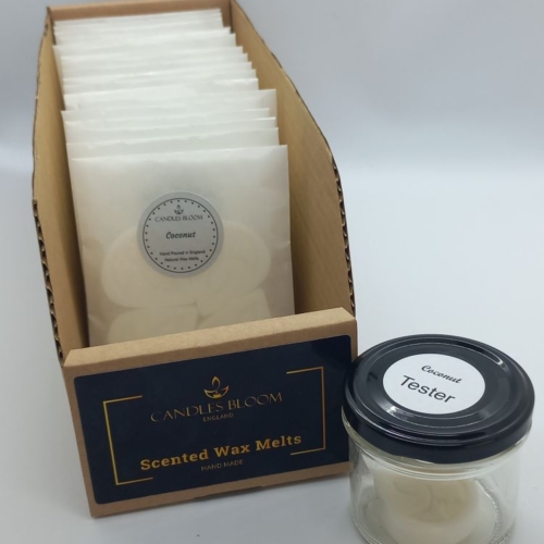A free wax melt sample as a tester will be provided in a glass jar on the first order. All repeat orders will contain a wax melt sample but not glass jar and only be available on request.