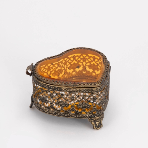Romantic and elegant, this heart-shaped jewelry box features Amber French beveled glass panels framed in ornate gold gilt filigree. Inspired by vintage French design, it beautifully showcases your treasured keepsakes while adding a touch of old-world charm to any vanity or dresser. Delicate yet durable, it’s the perfect blend of function and decoration—a timeless piece for storing rings, earrings, or small mementos in sophisticated style.