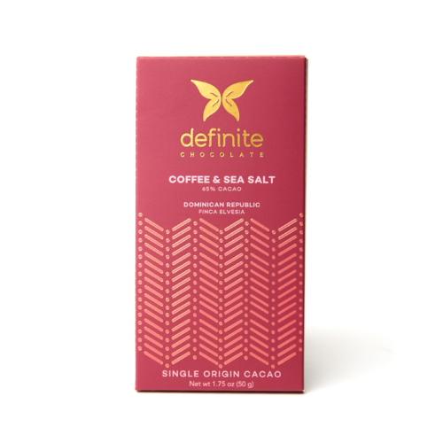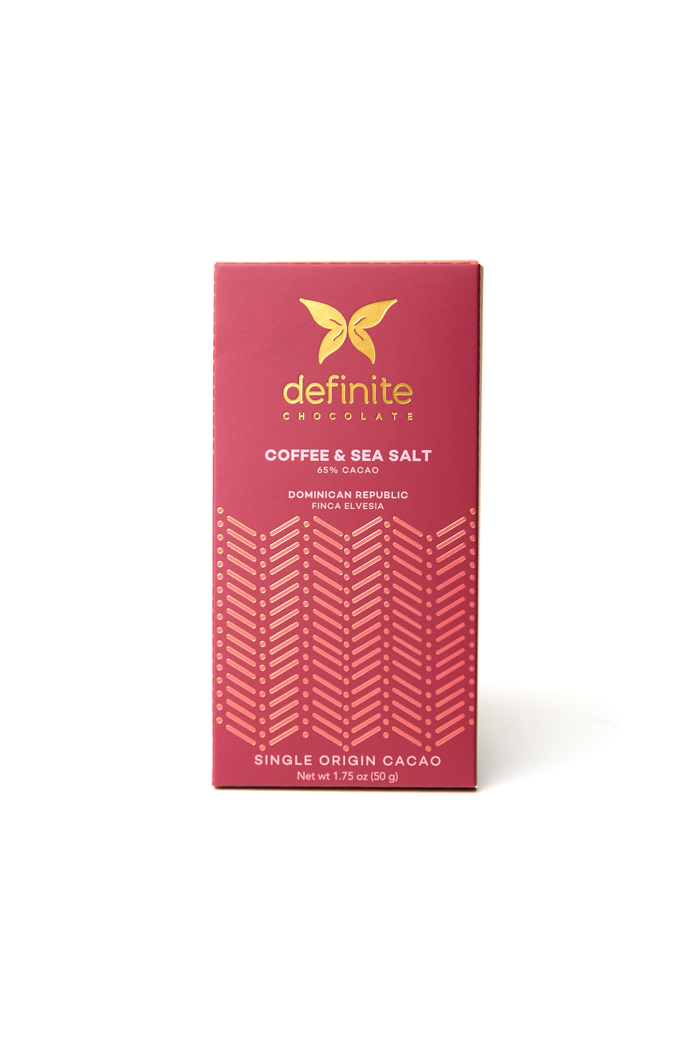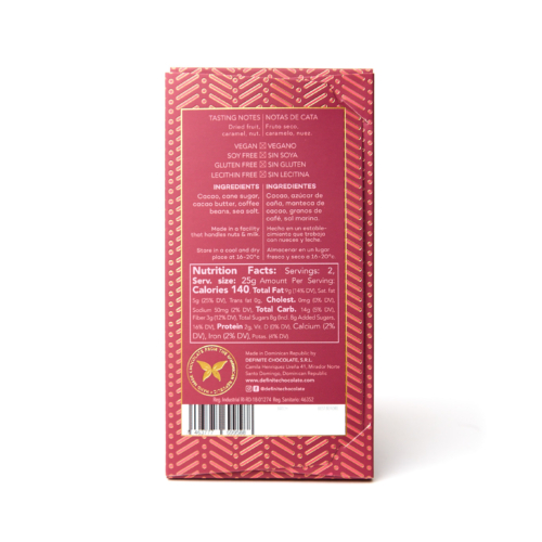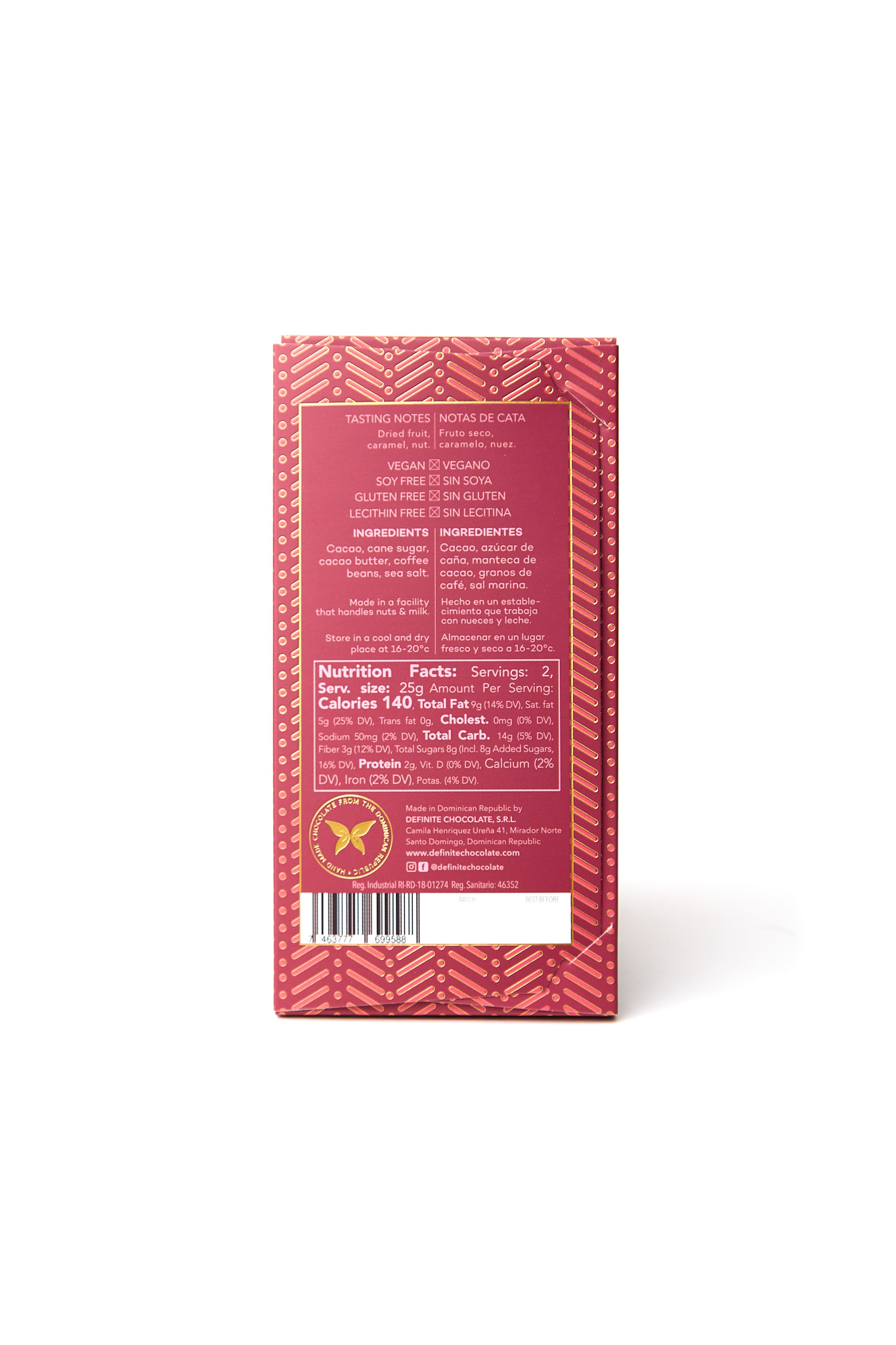 Ingredients: Organic cacao beans (65%), cane sugar, cacao butter, coffee beans, sea salt