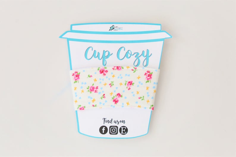 A beautiful coffee cup cozy in a white floral design