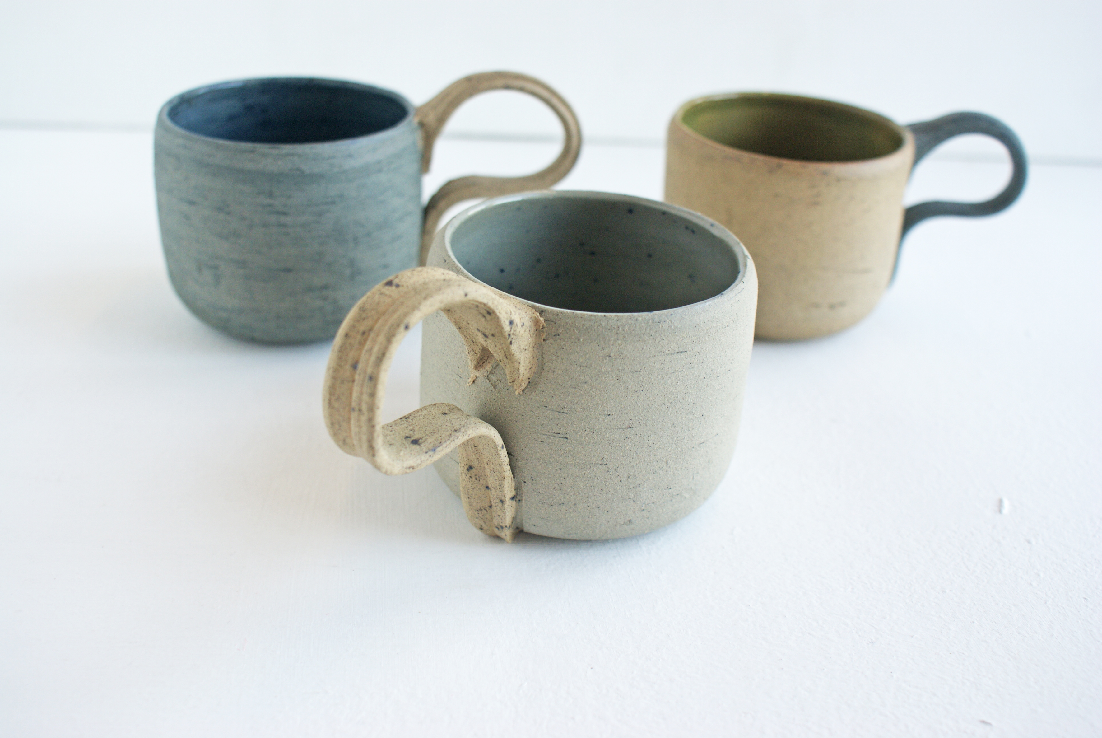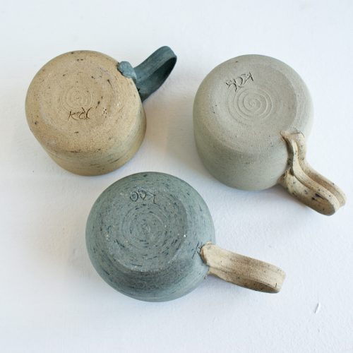 Thrown by hand in clay coloured by oxide, each of these Coffee Cups is unique in texture and character while following the same pattern of form and size. Each handle is hand-pulled in my complimentary oxide clay.