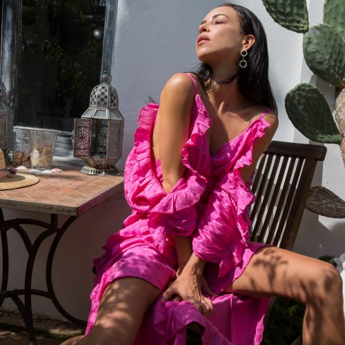 Colby… Isla Bonita’s Icon-dress, is a bright cerise pink bombshell of a shocker. Colby’s creation from traditional Spanish styling – with a modern twist and pop of colour – creates a flamenco frenzy; it’s cold-shoulder sleeve with frills running from top to toe accentuating the shape and fall the dress. Its center-front waterfall of layers and frills falling from the waist down will guarantee that million dollar thrilling feeling.