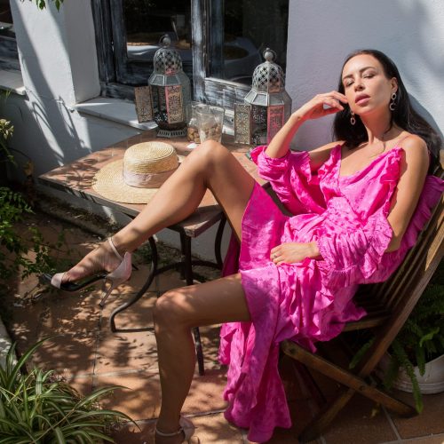 Colby… Isla Bonita’s Icon-dress, is a bright cerise pink bombshell of a shocker. Colby’s creation from traditional Spanish styling – with a modern twist and pop of colour – creates a flamenco frenzy; it’s cold-shoulder sleeve with frills running from top to toe accentuating the shape and fall the dress. Its center-front waterfall of layers and frills falling from the waist down will guarantee that million dollar thrilling feeling.