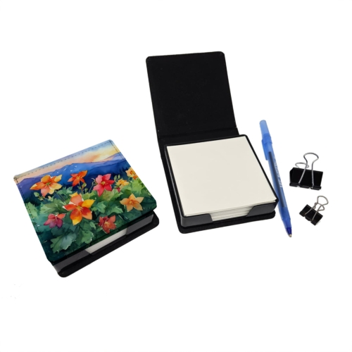 PU Leather Note Paper Holder featuring breed specific Colorado Rocky Mountain Columbine artwork. Elevate your workspace with this PU Leather Note Paper Holder, crafted to resemble luxurious leather without the use of animal products. Made from durable synthetic PU leather, it offers both a premium look and eco-friendly appeal. This note holder, compactly sized at 4.25 x 4.25 x 1.25 inches, includes about 160 sheets of 3.75 x 3.75-inch note paper—ideal for quick notes and reminders. An exclusive artist-designed cover makes each holder uniquely vibrant, adding a splash of color and personality to any desk or office. The discrete design keeps note paper hidden, maintaining a neat and organized workspace. Perfect as a gift or for personal use, this stylish holder is refillable with standard paper, ensuring long-lasting utility. A must-have for anyone seeking a sophisticated, artful touch to their workspace while supporting animal-friendly products. Add style, organization, and creativity to your everyday routine with this elegant note paper holder.