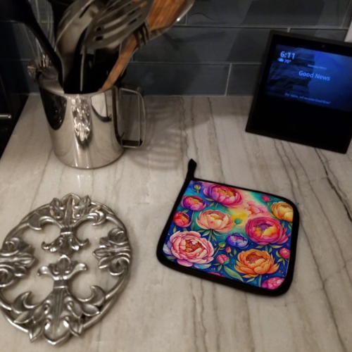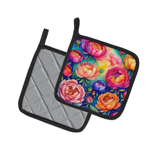 Pair of Pot Holders featuring breed specific Peonies artwork. A Pair of Pot Holders to match your kitchen decor. Made in the USA these are thick and functional. Full color artwork decorates the front polyester fabric of the hot pad and accented by a black trim. Use these at as a trivet for your Thanksgiving or Christmas tablescape. Filled with insulated fabric and quilted for durability. These colorful pot holders will make a great gift for your favorite home cook or executive chef. Each pot holder measures approximately 7 1/2 inches by 7 1/2 inches. A hanging tab is included.