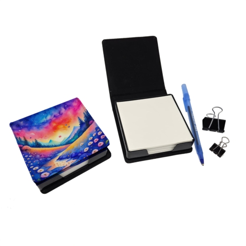 PU Leather Note Paper Holder featuring breed specific Periwinkles artwork. Elevate your workspace with this PU Leather Note Paper Holder, crafted to resemble luxurious leather without the use of animal products. Made from durable synthetic PU leather, it offers both a premium look and eco-friendly appeal. This note holder, compactly sized at 4.25 x 4.25 x 1.25 inches, includes about 160 sheets of 3.75 x 3.75-inch note paper—ideal for quick notes and reminders. An exclusive artist-designed cover makes each holder uniquely vibrant, adding a splash of color and personality to any desk or office. The discrete design keeps note paper hidden, maintaining a neat and organized workspace. Perfect as a gift or for personal use, this stylish holder is refillable with standard paper, ensuring long-lasting utility. A must-have for anyone seeking a sophisticated, artful touch to their workspace while supporting animal-friendly products. Add style, organization, and creativity to your everyday routine with this elegant note paper holder.