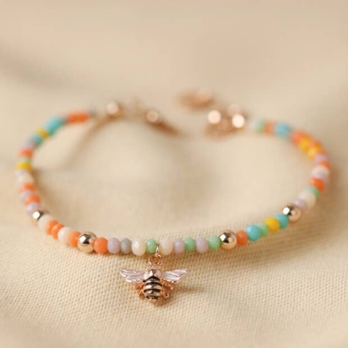 Brightly coloured faceted beads are accented by rose gold spacer beads and a bee charm with black and white highlights. Fastening via a lobster clasp and an adjustable slider, this bracelet can be worn at a variety of lengths, making it super versatile. Dimensionsinner circumference – min. 17.8cm, max 21.6cmMade fromplastic beads, 14ct rose gold plated brass