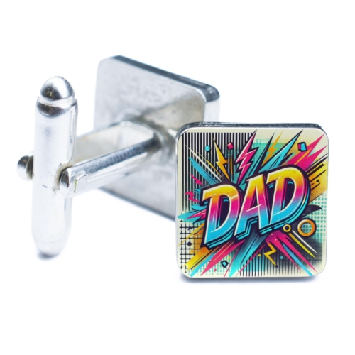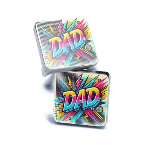 Celebrate the superhero in your life with these comic-inspired “Dad” cufflinks. Featuring a vibrant and dynamic design straight out of a comic book, these cufflinks are the perfect way to show your dad how much he means to you. The bold colors and playful details bring a touch of fun and personality to any formal outfit. Crafted with premium materials and finished with a polished silver look, these cufflinks are built to last while adding an extra flair of style. Whether for Father?s Day, a birthday, or just to say thank you, these cufflinks make a meaningful and fun gift. Presented in a stylish gift box, these cufflinks are ready to surprise and delight. Let your dad shine like the superhero he is with this unique and thoughtful accessory! Features a bold and colorful comic book-style “Dad” design, celebrating the superhero in your life. Dynamic and Fun: Bright colors and a striking design make these cufflinks a standout accessory for dads with a playful personality. Perfect for Fatherâs Day & Beyond: An ideal gift for Fatherâs Day, birthdays, or any occasion to show love and appreciation for your dad. Durable & Stylish: Made with high-quality materials and a polished silver finish, these cufflinks are both sturdy and elegant. Ready-to-Gift Packaging: Comes in a sleek presentation box, making it a hassle-free and thoughtful present for your dad.