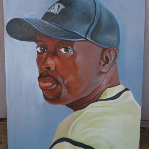 This is a famous Ghanaian musician, Oheneba Kissi. I saw his portrait painted on the side of a studio in Accra and asked them to reproduce the portrait in a smaller format so I could offer it for sale here. Please click on the photo to see the original, on the side of the studio. This one measures 24 x 32″ (61 x 81 cm).
