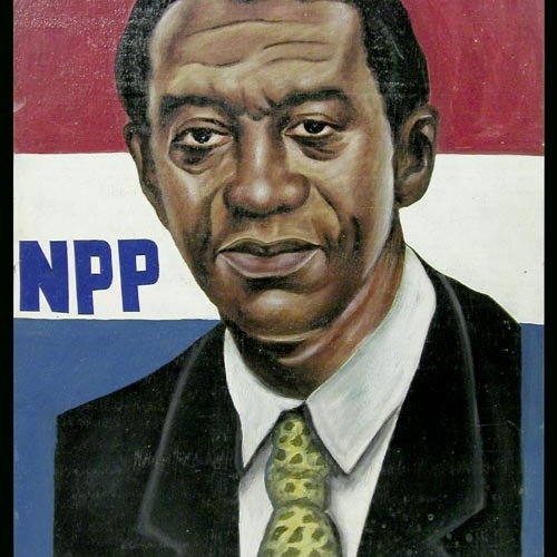 This signboard measures 24 x 23″. The man is John Kofi Agyekum Kufuor, President of Ghana 2001-2009. Ghana is one of the few countries in Africa where elections are truly free and fair and power is transfered peacefully. As in the US, Ghana allows a President to serve 2 4-year terms. Unlike in so many other countries in Africa Mr. Kufuor stood down after he completed his second term when John Atta-Mills was elected. He is the current president of Ghana. Mr. Kufuor had defeated Mr. Atta-Mills when he was originally elected. I was pleased to have happened to be in the same restaurant where Mr. Kufuor was eating lunch on day in Accra. I was surprised to see how tall and imposing a man he is. This sign measures 23 3/4 x 36″ (60 x 91 cm). NPP is the New Patriotic Party.
