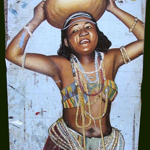 This is a painting that was displayed on the outside of a commercial art studio in Accra, called Dakar Art, painted by the artists there to use to advertise their own skill as painters. This signboard measures 46 1/2 x 28″ (118 x 71 cm).