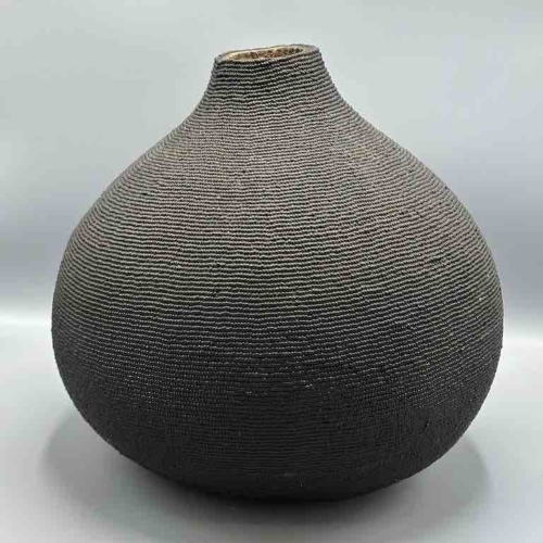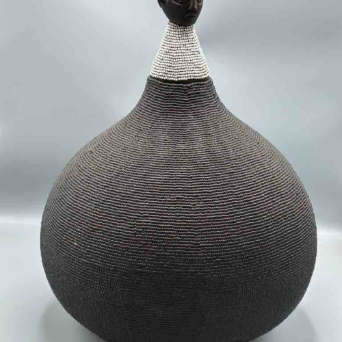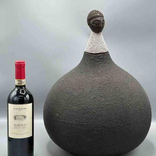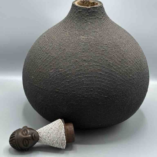 This very large natural gourd, covered with glass beads, has a carved wooden Congolese tribal head at the top of the stopper. These are traditional milk gourds used all over West Africa in different styles. We work with Congolese artisans, refugees in Kenya, to obtain these extraordinarily fine quality objects. 18 x 12” (46 x 30.5 cm)