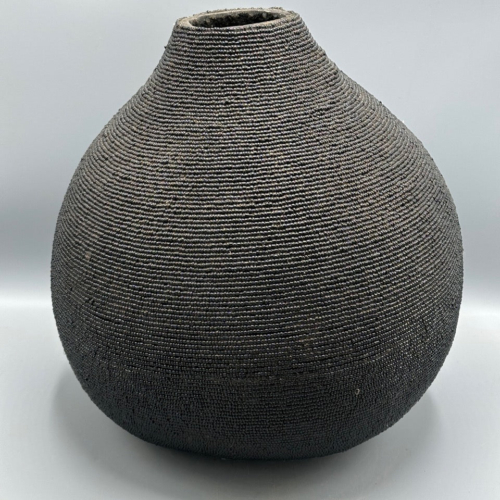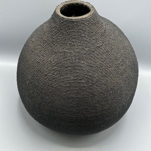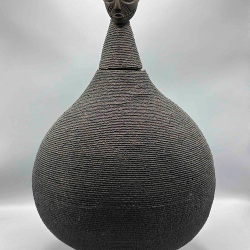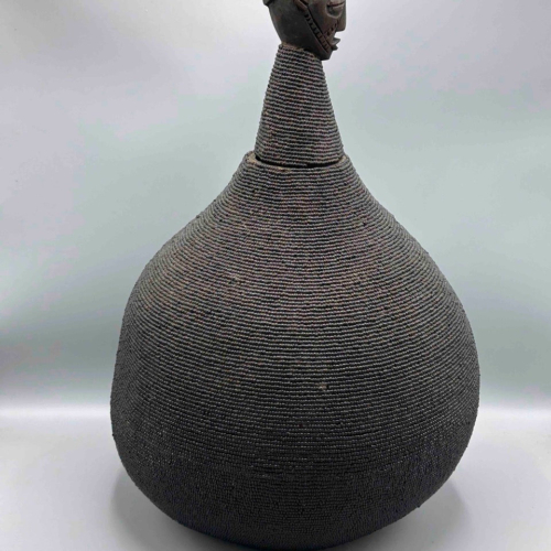 This very large natural gourd, covered with glass beads, has a carved wooden Conglese tribal head at the top of the stopper. These are traditional milk gourds used all over West Africa in different styles. We work with Congolese artisans, refugees in Kenya, to obtain these extraordinarily fine quality objects. 19 1/2 x 12 1/2” (49.5 x 32 cm)