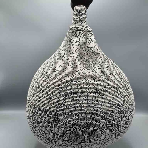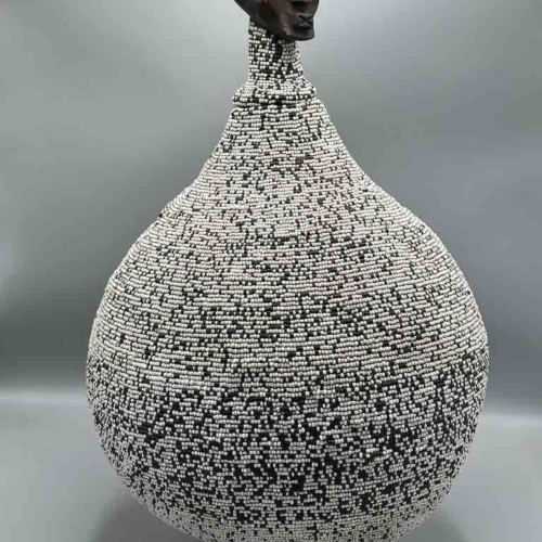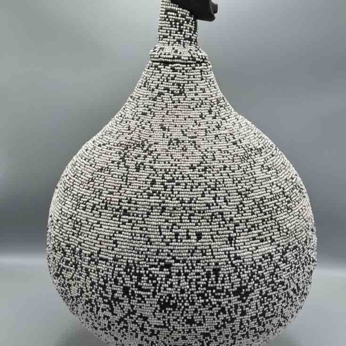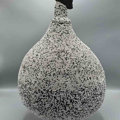 This very large natural gourd, covered with glass beads, has a carved wooden Conglese tribal head at the top of the stopper. These are traditional milk gourds used all over West Africa in different styles. We work with Congolese artisans, refugees in Kenya, to obtain these extraordinarily fine quality objects. 19 x 12” (48 x 30.5 cm)