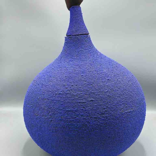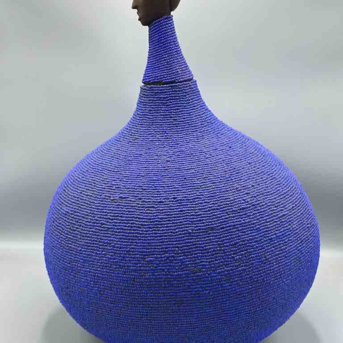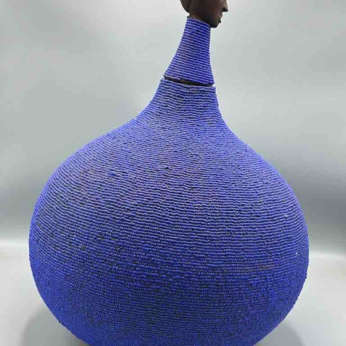 This very large natural gourd, covered with glass beads, has a carved wooden Congolese tribal head at the top of the stopper. These are traditional milk gourds used all over West Africa in different styles. We work with Congolese artisans, refugees in Kenya, to obtain these extraordinarily fine quality objects. 21 1/2 x 13” (55 x 33 cm)