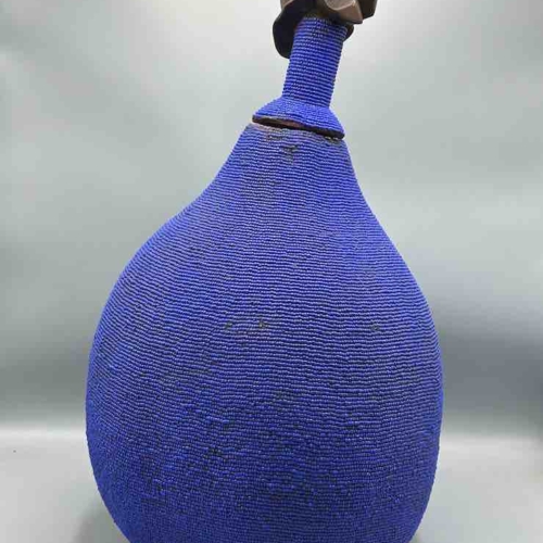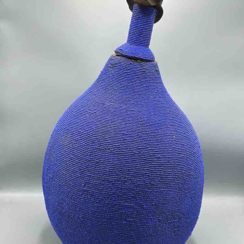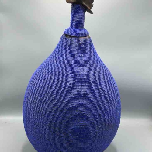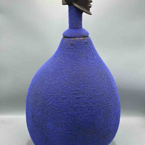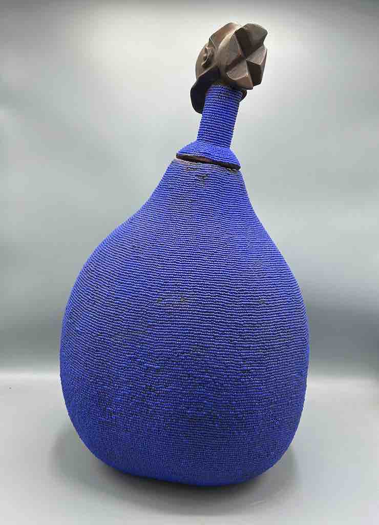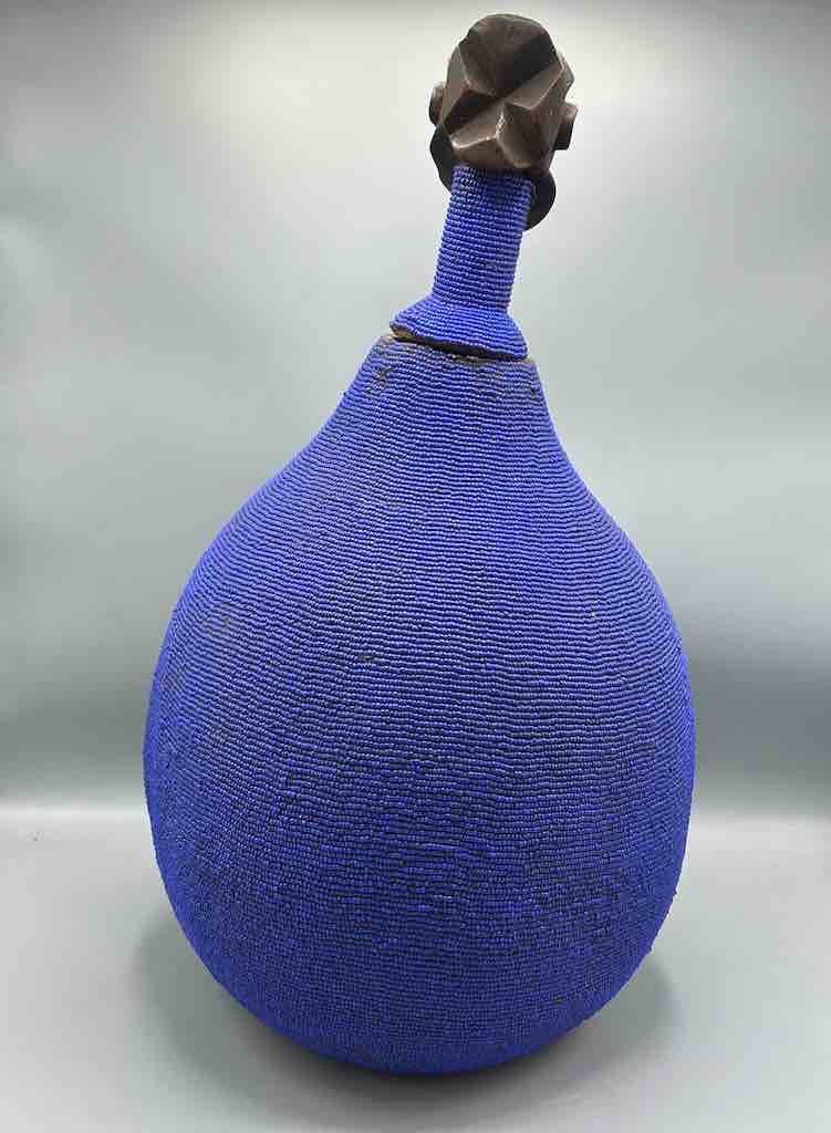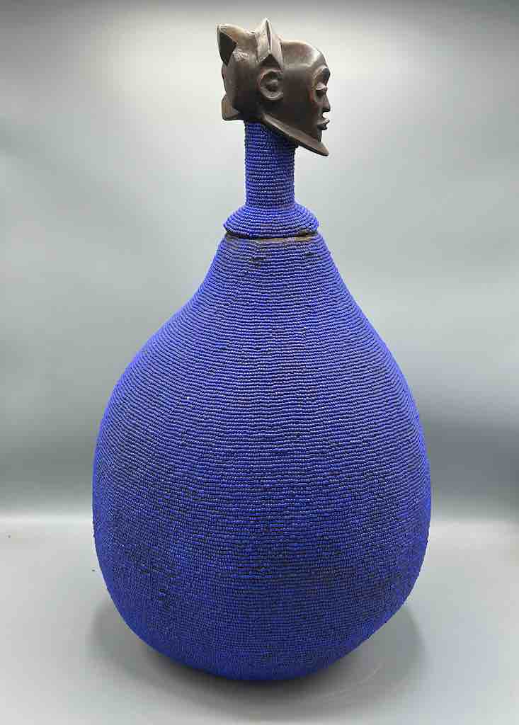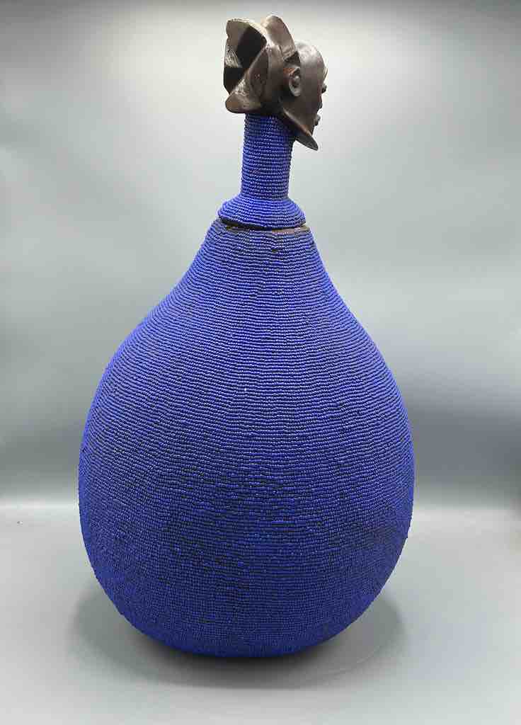 This very large natural gourd, covered with glass beads, has a carved wooden Congolese tribal head at the top of the stopper. These are traditional milk gourds used all over West Africa in different styles. We work with Congolese artisans, refugees in Kenya, to obtain these extraordinarily fine quality objects. 24 1/2 x 12 1/2” (62 x 32 cm)