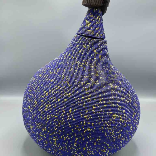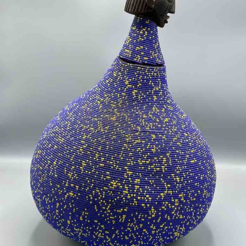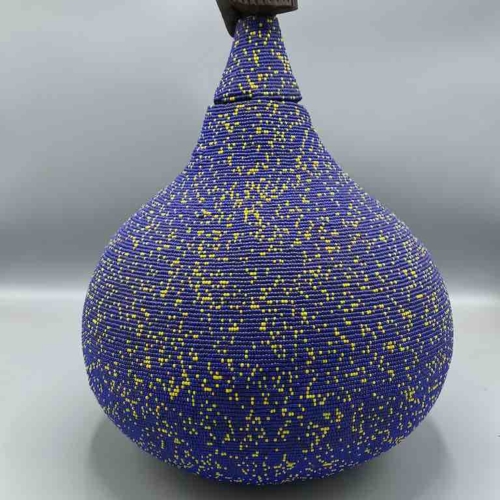 This very large natural gourd, covered with glass beads, has a carved wooden Congolese tribal head at the top of the stopper. These are traditional milk gourds used all over West Africa in different styles. We work with Congolese artisans, refugees in Kenya, to obtain these extraordinarily fine quality objects. 18 x 11 1/2” (46 x 29 cm)