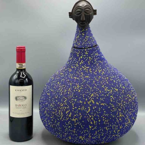 This very large natural gourd, covered with glass beads, has a carved wooden Congolese tribal head at the top of the stopper. These are traditional milk gourds used all over West Africa in different styles. We work with Congolese artisans, refugees in Kenya, to obtain these extraordinarily fine quality objects. 18 x 11 1/2” (46 x 29 cm)
