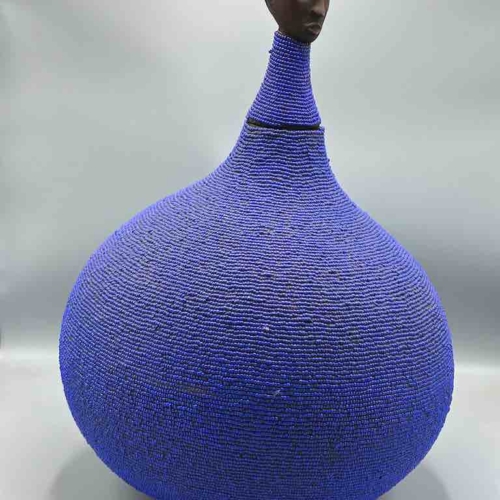 This very large natural gourd, covered with glass beads, has a carved wooden Congolese tribal head at the top of the stopper. These are traditional milk gourds used all over West Africa in different styles. We work with Congolese artisans, refugees in Kenya, to obtain these extraordinarily fine quality objects. 21 1/2 x 13” (55 x 33 cm)