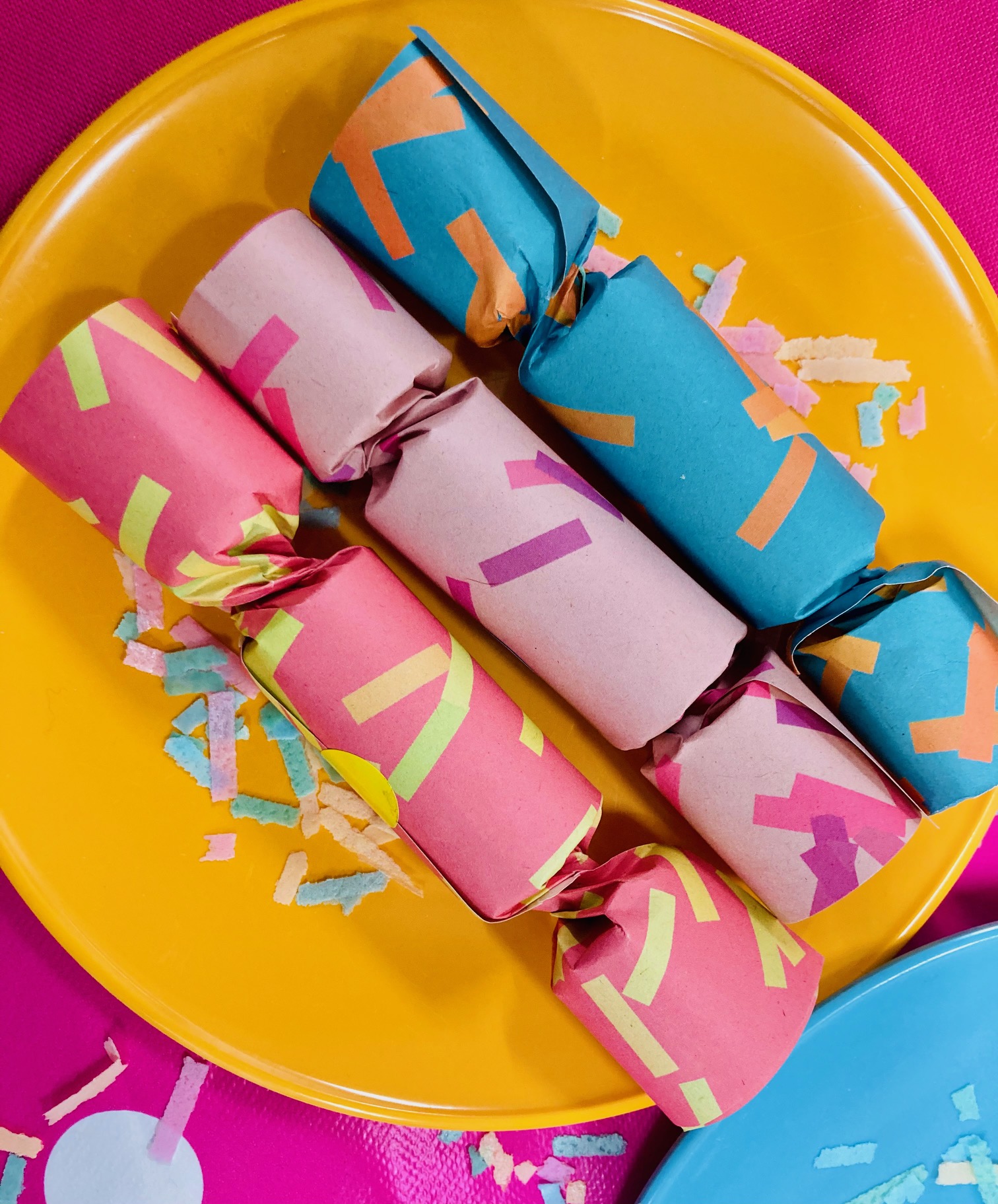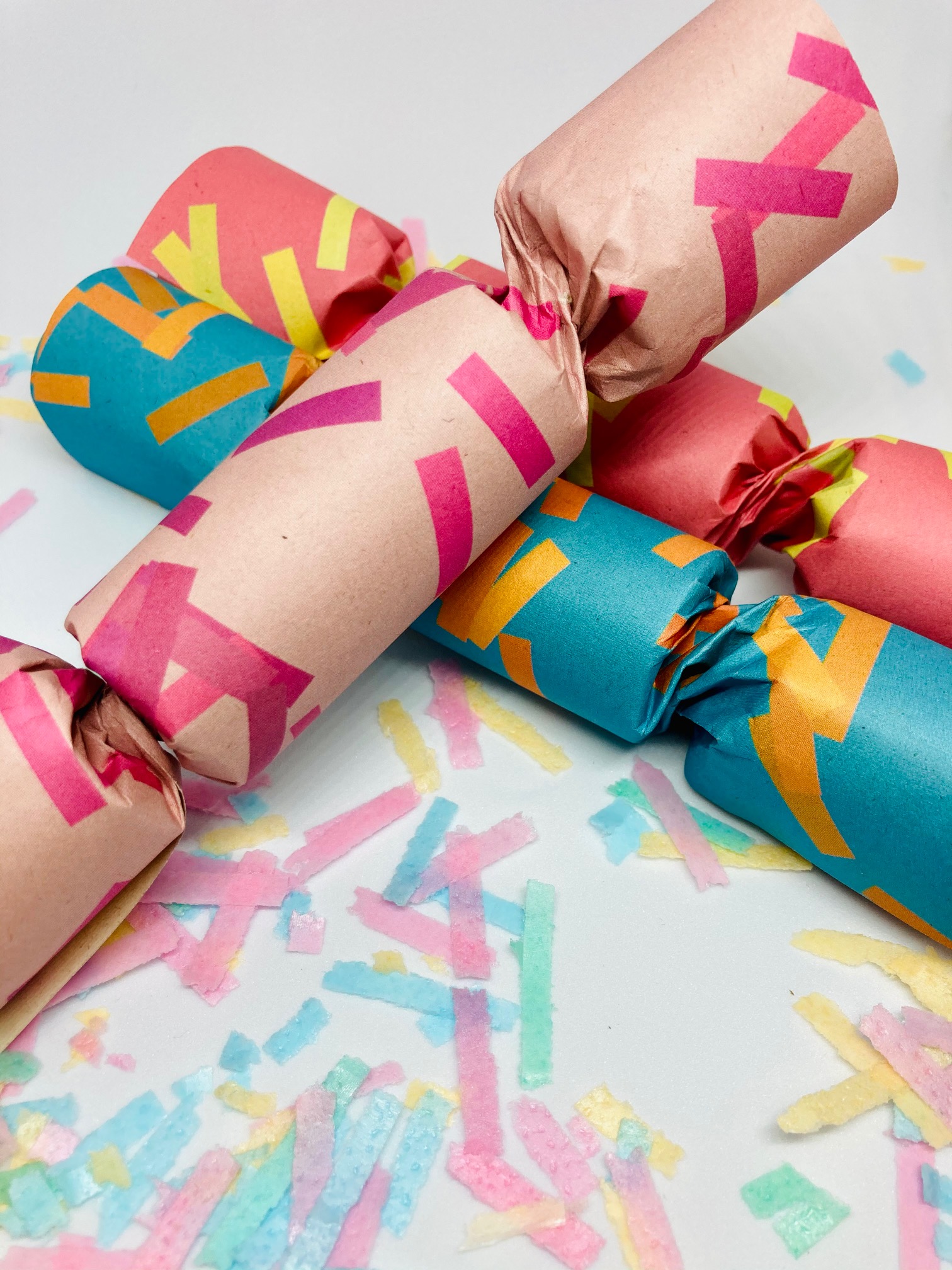 There are three crackers in a box in two variations: Pine (three green) and Party (Two pink and one blue).