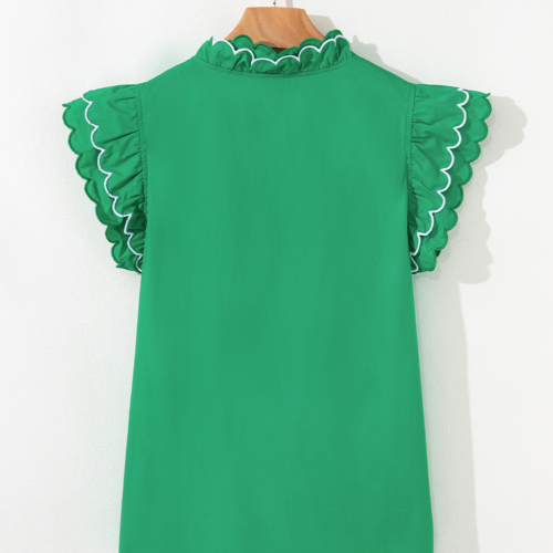 It features scalloped detailing on the neck and sleeves.