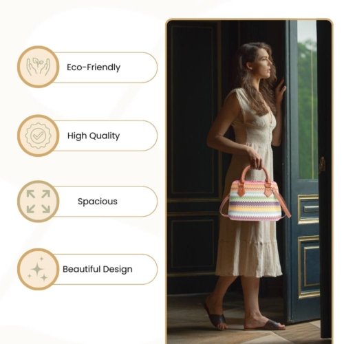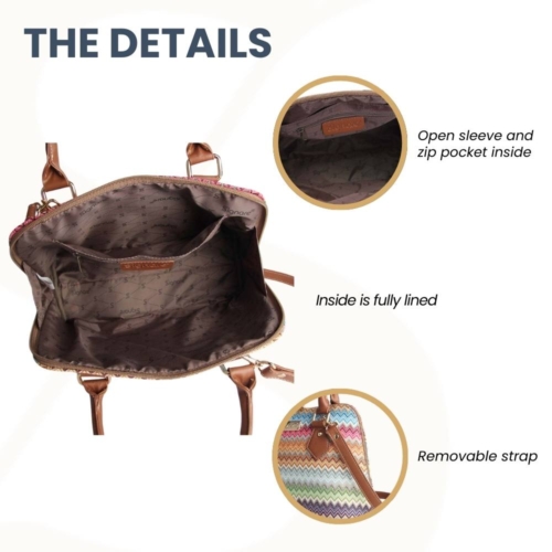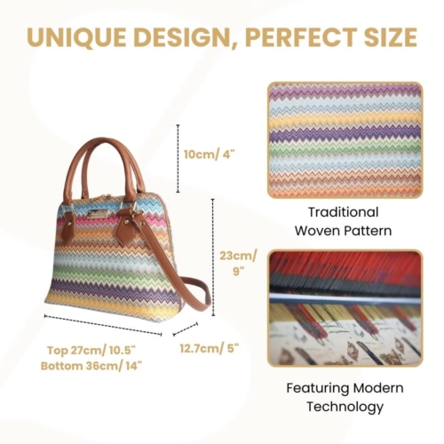 FABRIC COMPOSITION: 100% Polyester.EASY CARE: Clean it with a damp cloth. Do not soak in water.Express your individuality through Signare’s exclusive shoulder bags for women.[custom_html]UNIQUE LIFESTYLE DESIGN: Inspired by the Mexican culture, Aztec art and Aztec symbols, this color pattern has a vibrant design which radiates like the spectrum of a rainbow, splashing a zig zag wave of colour across the tapestry pattern.PRODUCT DESCRIPTION: Proven to be one of our most popular tapestry bags with shoulder strap styles and one of the best shoulder bags for women. This elegantly designed classic top handled handbag is one that can serve as a fantastic choice for your everyday needs Brilliant choice for small travel, evening walks or overnight Features a modest area for storing your handbag essentials, with an open sleeve and zip up pocket also featured on the inside Fully lined with a patterned nylon Faux leather handle and detachable shoulder straps included Has the option to be worn as a handbag or converted into a cross body or shoulder style bag Fitted with a full length zip fastener Solid base with 4 studded feet Size: 12.5 x 9 x 5 inches – Weight: 1 lb See All Convertible/Top Handle Purse Bag Designs See All The Styles/Models in Aztec Collection [/custom_html]