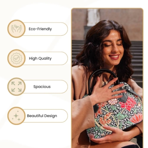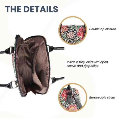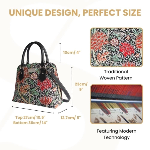 FABRIC COMPOSITION: 100% Polyester.EASY CARE: Clean it with a damp cloth. Do not soak in water.Express your individuality through Signare![custom_html]UNIQUE LIFESTYLE DESIGN: The flourishing flowers of William Morrisäó»s The Cray creates a swirling pattern of flora and burst of colors that are delicately woven throughout this tapestry pattern. It pairs perfectly with the William Morris art Strawberry Thief range from Signare; creating an admirable collection of art-inspired designs. Both are from the most popular William Morris designs. PRODUCT DESCRIPTION: Proven to be one of our most popular tapestry bags with shoulder strap styles and one of the best shoulder bags for women. This elegantly designed classic top handled handbag is one that can serve as a fantastic choice for your everyday needs Brilliant choice for small travel, evening walks or overnight Features a modest area for storing your handbag essentials, with an open sleeve and zip up pocket also featured on the inside Fully lined with a patterned nylon Faux leather handle and detachable shoulder straps included Has the option to be worn as a handbag or converted into a cross body or shoulder style bag Fitted with a full length zip fastener Solid base with 4 studded feet Size: 12.5 x 9 x 5 inches – Weight: 1 lb See All Convertible/Top Handle Purse Bag Designs See All The Styles/Models in The Cray Collection [/custom_html]