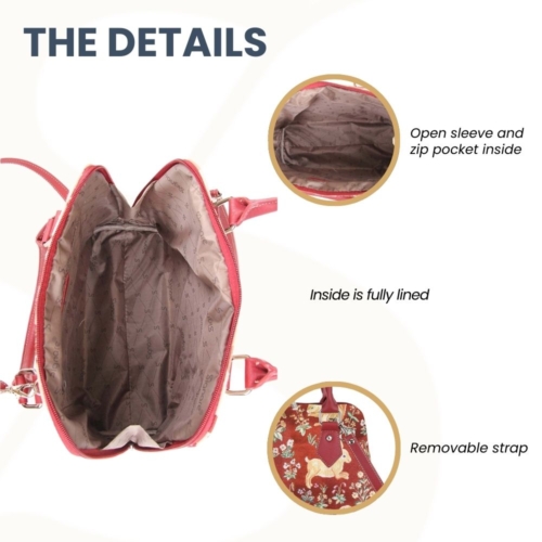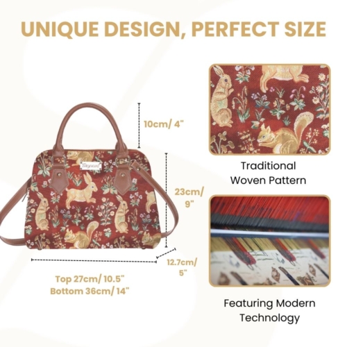 FABRIC COMPOSITION: 100% Polyester.EASY CARE: Clean it with a damp cloth. Do not soak in water.Express your individuality through Signare! [custom_html]UNIQUE LIFESTYLE DESIGN: Drawing inspiration from the wall hangings of Tudor England, this captivating design is based upon the Mille Fleur style from the Lady & Unicorn tapestry piece. Adorable woodland critters playfully adorn the piece; as rabbits and squirrels frolic amongst a colorful collage of fauna. PRODUCT DESCRIPTION: Proven to be one of our most popular tapestry bags with shoulder strap styles and one of the best shoulder bags for women. This elegantly designed classic top handled handbag is one that can serve as a fantastic choice for your everyday needs Brilliant choice for small travel, evening walks or overnight Features a modest area for storing your handbag essentials, with an open sleeve and zip up pocket also featured on the inside Fully lined with a patterned nylon Faux leather handle and detachable shoulder straps included Has the option to be worn as a handbag or converted into a cross body or shoulder style bag Fitted with a full length zip fastener Solid base with 4 studded feet Size: 12.5 x 9 x 5 inches – Weight: 1 lb See All Convertible/Top Handle Purse Bag Designs [/custom_html]