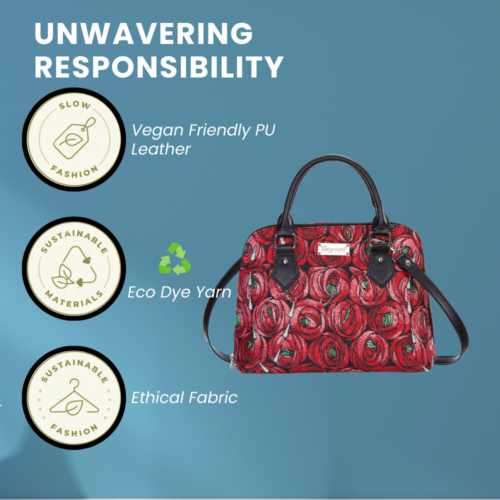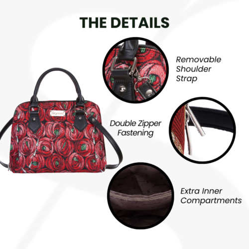 FABRIC COMPOSITION: 100% Polyester.EASY CARE: Clean it with a damp cloth. Do not soak in water.Express your individuality through Signare![custom_html]UNIQUE LIFESTYLE DESIGN: Throughout his career, the Scottish designer Charles Rennie Mackintosh experimented with stylised roses, and the Mackintosh rose motif recurs in much of his art. This sumptuous design depicts teardrops gently falling onto dark pink roses and the beginnings of art nouveau, the movement Rennie Mackintosh helped to inspire can be seen clearly in the pink roses. PRODUCT DESCRIPTION: Proven to be one of our most popular tapestry bags with shoulder strap styles and one of the best shoulder bags for women. This elegantly designed classic top handled handbag is one that can serve as a fantastic choice for your everyday needs Brilliant choice for small travel, evening walks or overnight Features a modest area for storing your handbag essentials, with an open sleeve and zip up pocket also featured on the inside Fully lined with a patterned nylon Faux leather handle and detachable shoulder straps included Has the option to be worn as a handbag or converted into a cross body or shoulder style bag Fitted with a full length zip fastener Solid base with 4 studded feet Size: 12.5 x 9 x 5 inches – Weight: 1 lb See All Convertible/Top Handle Purse Bag Designs See All The Styles/Models in Rennie Mackintosh Rose and Teardrop Collection [/custom_html]