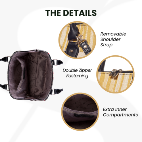 FABRIC COMPOSITION: 100% Polyester.EASY CARE: Clean it with a damp cloth. Do not soak in water.Express your individuality through Signare! [custom_html] PRODUCT DESCRIPTION: Proven to be one of our most popular tapestry bags with shoulder strap styles and one of the best shoulder bags for women. This elegantly designed classic top handled handbag is one that can serve as a fantastic choice for your everyday needs Features a modest area for storing your handbag essentials, with an open sleeve and zip up pocket also featured on the inside Fully lined with a patterned nylon Faux leather handle and detachable shoulder straps included, handle drop approx. 4″ and max shoulder strap length approx. 45″ Fitted with a full length zip fastener Solid base with 4 studded feet Product dimensions approx. W 14″ (Bottom)/ 10.5″ (Top) X H 9″ X D 5″ Weight: 1 lb [/custom_html]