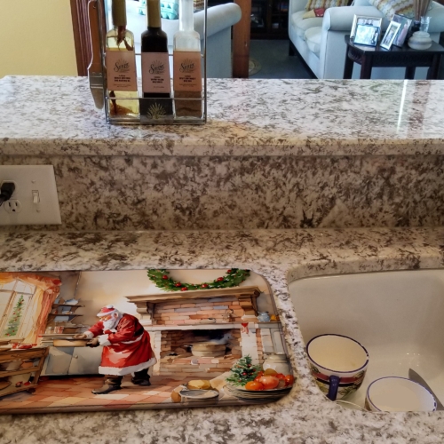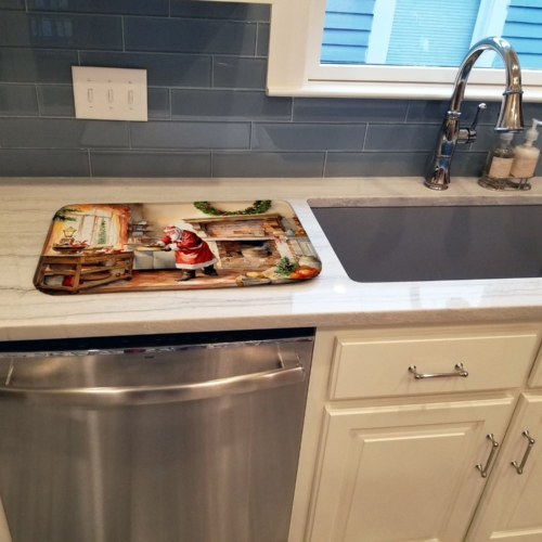 Dish Drying Mat featuring breed specific Santa Claus artwork. Celebrate Christmas with this Christmas Dish Drying Mat. Say goodbye to messy countertops and soggy dish towels with our innovative dish drying mat. Our high-quality dish drying pad is designed to keep your countertops dry while offering a stylish and efficient solution. Whether you’re air drying dishes, glasses, stemware, silverware, pots, pans, bottles, or even fruits and vegetables, our dish mat is the perfect choice. The 14 inches x 22 inches size fits most counters and dish drying racks, and the non-slip design ensures stability. Made with water-absorbent polyester and a polyurethane foam insert, our dish drying mat is not only functional but also durable. It’s machine washable and printed in the USA for long-lasting use. The beautiful artwork adds flair to your kitchen decor, making it a perfect housewarming gift or present for any occasion. Upgrade your kitchen experience with our absorbent and versatile dish drying mat.