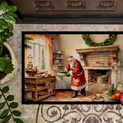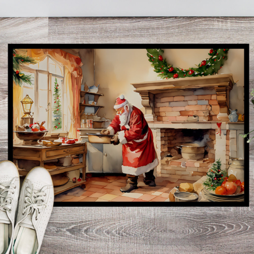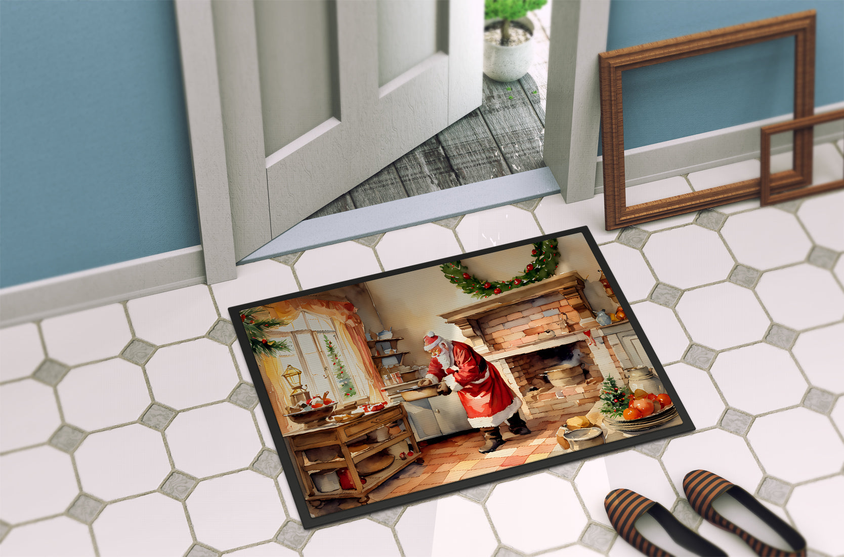 Doormat featuring breed specific Santa Claus artwork. Celebrate Christmas with this Christmas Doormat. Welcome your guests in style with our Artwork Door Mat, designed to withstand almost any weather condition. This mat, measuring approximately 24 by 36 inches, is held together by durable black binding tape. Its top layer, composed of polyester felt, is dyed with the eye-catching image you see on the mat. A few layers below provide the mat with stability, while its rubber bottom is stamped to help prevent slipping and ensures safety. Our mat works wonderfully as both an indoor or outdoor door mat. For cleaning, simply hose it off with water or use a power washer – no need for any cleaner that produces suds. Avoid scrubbing with a brush, instead, opt for the vacuum on floor setting. Designed manufactured and printed in the USA, this mat is a perfect addition to your porch, outdoor kitchen, entryway, or any indoor space. Its unique design makes it a charming decorative rug that greets your guests and adds a stylish touch to your home decor.