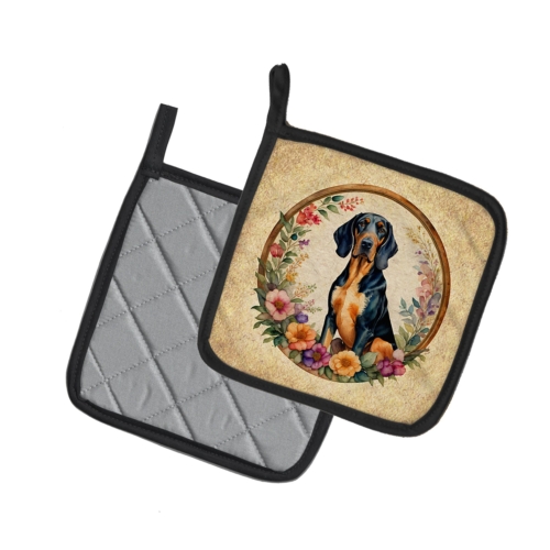 Pair of Pot Holders featuring breed specific Coonhound artwork. A Pair of Pot Holders to match your kitchen decor. Made in the USA these are thick and functional. Full color artwork decorates the front polyester fabric of the hot pad and accented by a black trim. Use these at as a trivet for your Thanksgiving or Christmas tablescape. Filled with insulated fabric and quilted for durability. These colorful pot holders will make a great gift for your favorite home cook or executive chef. Each pot holder measures approximately 7 1/2 inches by 7 1/2 inches. A hanging tab is included.