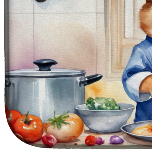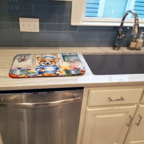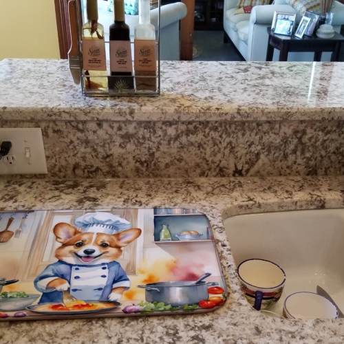 Dish Drying Mat featuring breed specific Corgi artwork. Say goodbye to messy countertops and soggy dish towels with our innovative dish drying mat. Our high-quality dish drying pad is designed to keep your countertops dry while offering a stylish and efficient solution. Whether you’re air drying dishes, glasses, stemware, silverware, pots, pans, bottles, or even fruits and vegetables, our dish mat is the perfect choice. The 14 inches x 22 inches size fits most counters and dish drying racks, and the non-slip design ensures stability. Made with water-absorbent polyester and a polyurethane foam insert, our dish drying mat is not only functional but also durable. It’s machine washable and printed in the USA for long-lasting use. The beautiful artwork adds flair to your kitchen decor, making it a perfect housewarming gift or present for any occasion. Upgrade your kitchen experience with our absorbent and versatile dish drying mat.