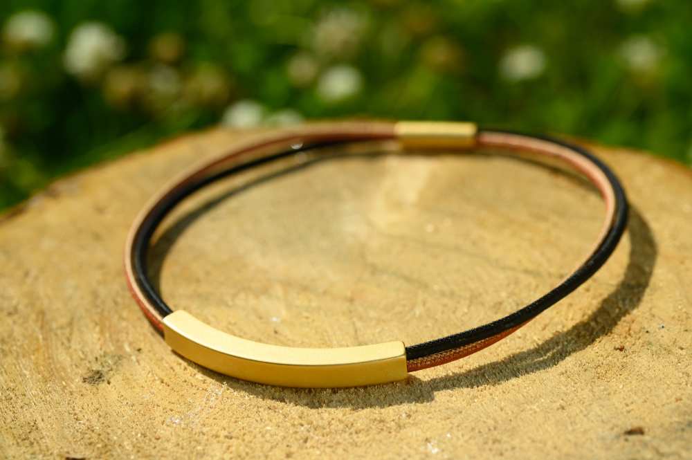 Cork necklace salmon-red-black with mat goldplated part