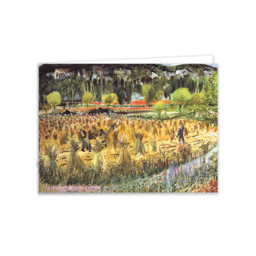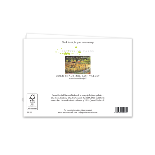 A lyrical harvest study from the Lot Valley, France: rows of corn stacks and small figures set beneath a deep green tree line. Rendered in gouache and pastel for grainy texture and a warm, late-summer palette. Ideal across countryside, travel and fine-art ranges.